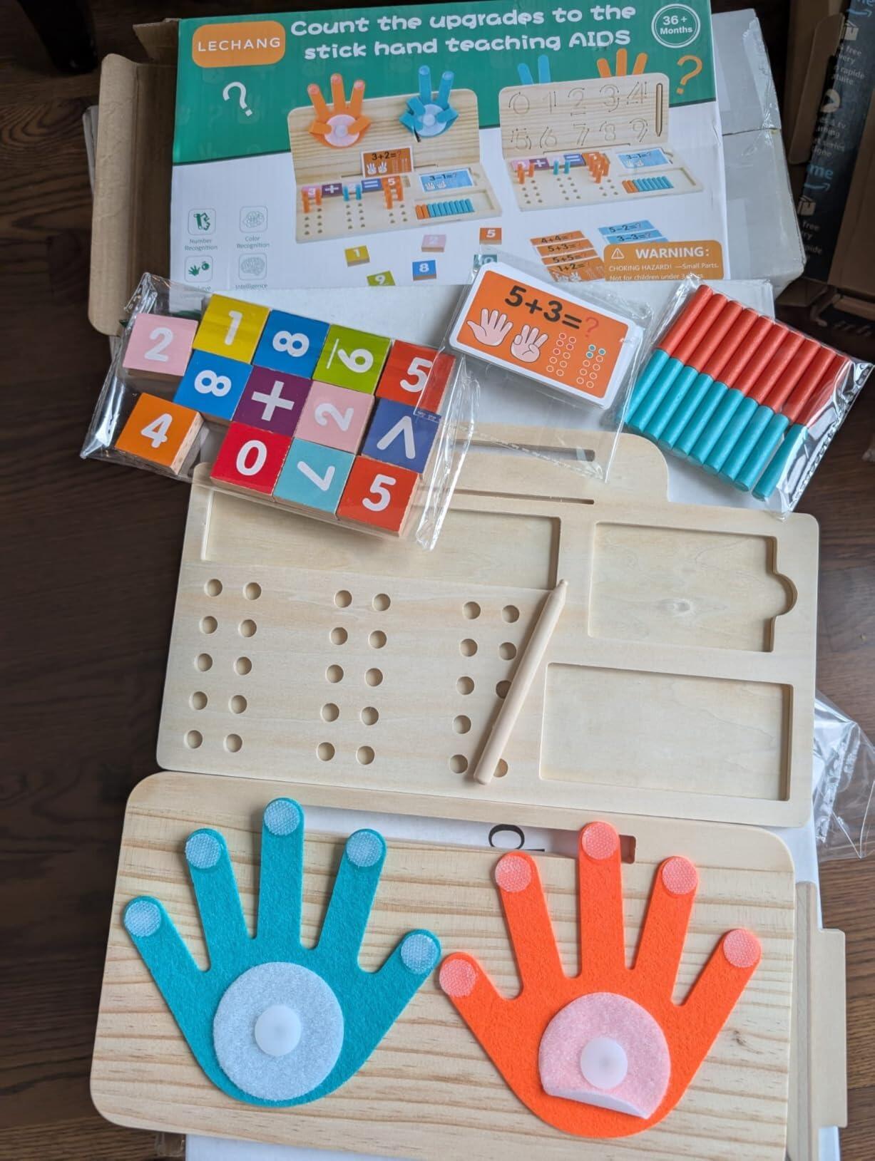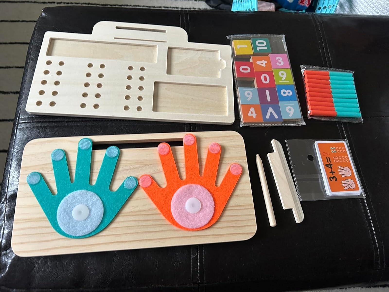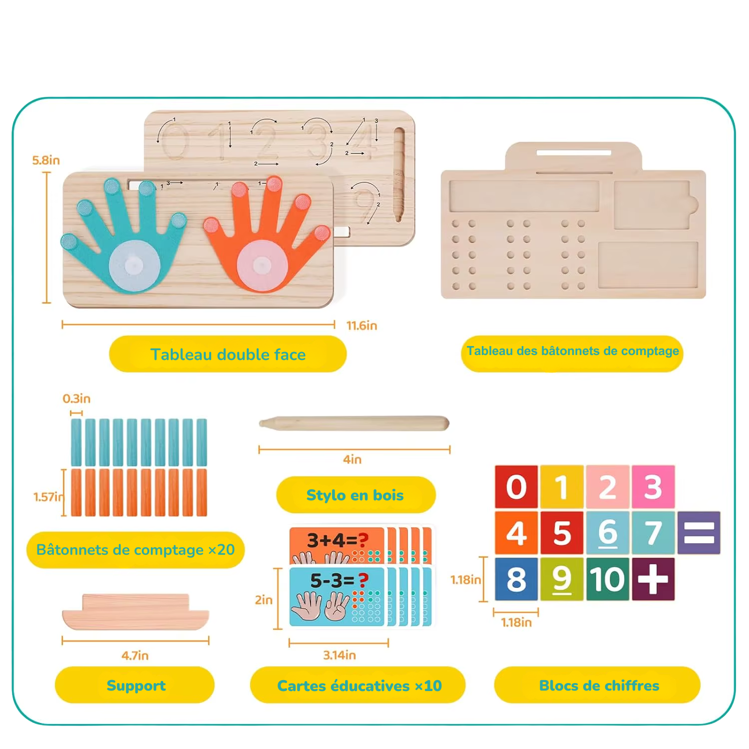 Contrairement aux jouets génériques qui se ressemblent tous, ce coffret se distingue par ses mains en feutrine rotatives : elles permettent à l’enfant de visualiser les chiffres comme avec ses propres doigts, rendant chaque opération claire et intuitive.